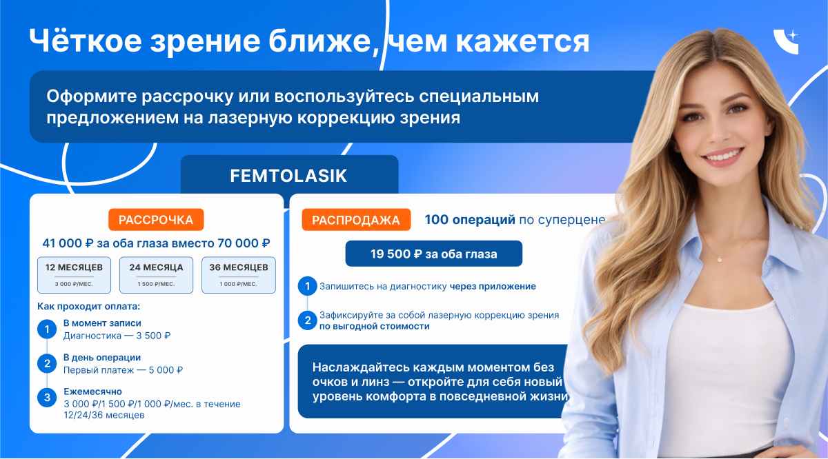 Также сейчас его можно сделать с наибольшей выгодой, 38 500 р. вместо 70 000 рублей, за оба глаза.